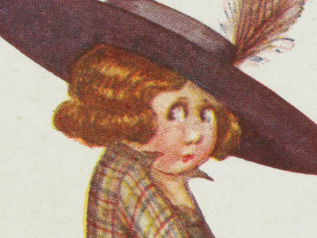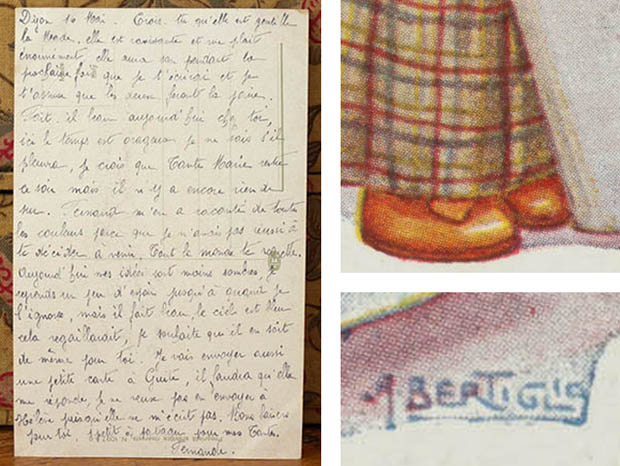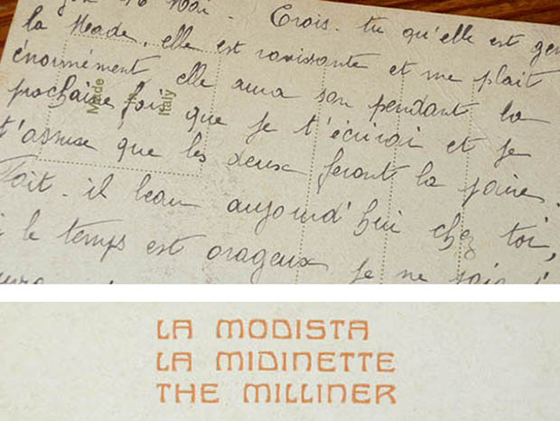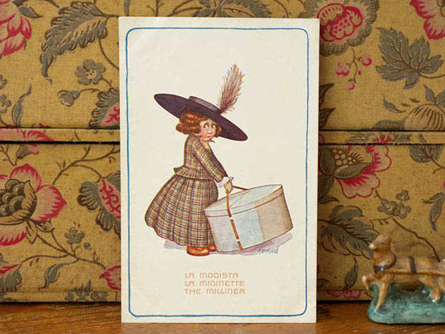 イタリアでおそらく1910年代に製造された厚紙製のラガッツァ・アル・モディスタ・カルトリーナです。こちらは大変レアな画家のAurelio Bertiglia(アウレリオ・ベルティリア)が描いた可愛いラガッツァ(少女)のイラストがデザインされたCartolina(カルトリーナ/ハガキ)です。アウレリオ・ベルティリア(1891-1973)は、可愛い子供達を沢山描いて有名ですが、政治風刺画でさえ軍人や政治家を子供として描いたようです。本体の表面には、頭に羽飾りの付いた黒い大きな帽子をかぶってスコッツェーゼ(チェック)柄のヴェスティート(ドレス)を着た婦人用の帽子屋で働いているラガッツァが、大きな帽子の入った箱を持っているイラストがデザインされていてオシャレで可愛くてとてもいい感じです。また、イラストにはAurelio Bertigliaの署名があります。また、下部にはイタリア語でLa Modista(ラ・モディスタ/婦人用の帽子屋)、フランス語でLa Midinette (ミディネット/婦人用の帽子屋)、英語でThe Milliner(ザ・ミリナー/婦人用の帽子屋)の表示もあるのでパリやロンドンでも販売されていたようです。また、裏面にはMade in ItalyとProprieta artistica riservata(保護された芸術的所有権)などの表示もあります。見ているだけで当時のイタリアの可愛いラガッツァ達に気持ちが優しく癒されてしまいそうな大変素晴らしい一品です。