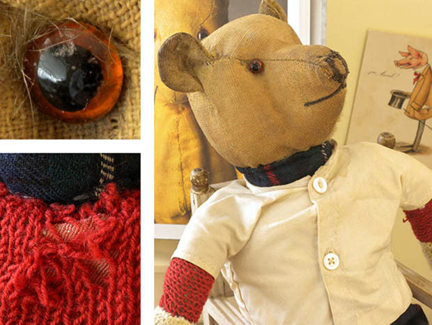 モヘアはほとんど抜けています。ガラスの目に多少のキズがありますが欠けや割れはなくとてもきれいです。お鼻の刺繍に破れがありますがお口の刺繍はきれいです。ジョイントは全て動きませんがお座りができます。プローヴァーに破れがあります。プローヴァー以外の服などは脱がすことはできません。クイットシャーは押しても鳴きません。その他、傷みや汚れなどありますが古いテディベアの貫禄があって状態が良くきれいで、Good Conditionです。