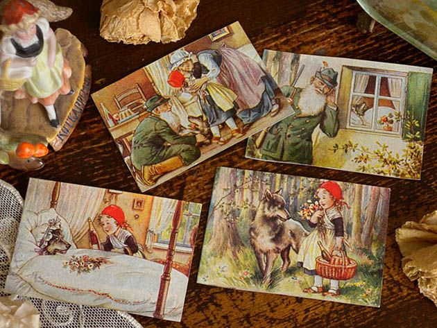 ドイツでおそらく1930年代に製作された厚紙製のロートカピヒェン&ヴォルフ・グランツビルダー4ゼッツです。こちらは超レアなRotkappchen(ロートカピヒェン/赤ずきんちゃん)の楽しいお話の場面のGlanzbilder(グランツビルダー/ダイカットスクラップ)の4枚のゼッツ(セット)で、最初のグランツビルダーには森の家に住んでいる病気のおばあさんにコルプ(バスケット)に入ったクーヘン(焼き菓子)と葡萄酒を届けに行く途中の道で親切そうな悪いヴォルフ(オオカミ)に出会ったロートカピヒェン、2枚目のグランツビルダーには悪いヴォルフが病気のおばあさんに変装してベッツ(ベッド)に寝ているとは知らないで、きれいなお花とお母さんが焼いてくれたクーヘンと葡萄酒を渡しているロートカピヒェン、3枚目のグランツビルダーにはおばあさんとロートカピヒェンを食べてお腹がいっぱいになってベッツで眠っている悪いヴォルフの大いびきをおばあさんの家の窓の外で聞いている猟師、4枚目のグランツビルダーには眠っている悪いヴォルフのお腹を猟師が切り裂いて助け出されて喜んでいるおばあさんとロートカピヒェンのイラストがデザインされていてどれもオシャレで可愛くてとてもいい感じです。また、ロートカピヒェンのお話はフランス人のシャルル・ペローが1697年に出版した「ペロー童話集」の中にありますが、1812年頃にドイツ人のグリム兄弟がキンダー(チャイルド)達のために可愛くリメイクして有名になったようです。グランツビルダーを見ているだけでロートカピヒェンの可愛い世界に引き込まれてしまいそうなとても可愛い一品です。