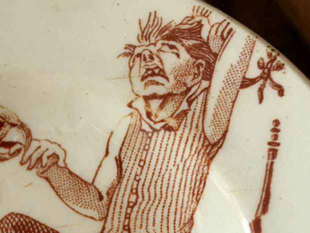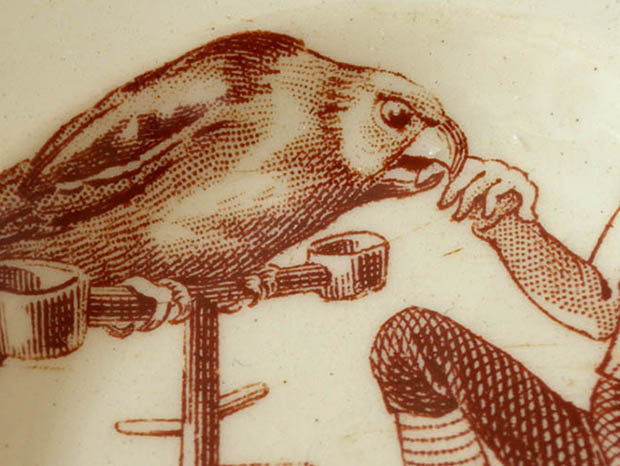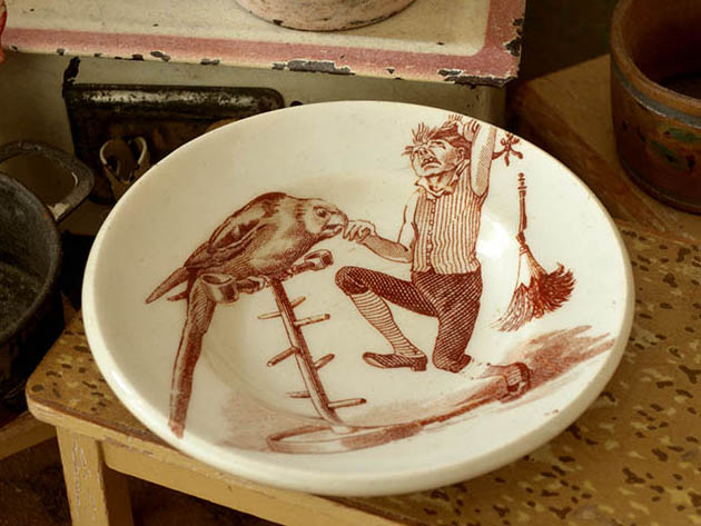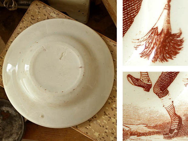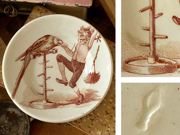 フランスでおそらく1890年代に製作されたLuneville Faience(リュネヴィル・ファイアンス/リュネヴィル陶器)のアンファンディネット・リュネヴィルアシェットです。フランスのナンシーから南東へ20kmほど行ったロレーヌ地方のリュネヴィルの町で1711年にJacques Chambrette(ジャック・シャンブレット)が陶器工場を創業したのがリュネヴィル・ファイアンスの始まりのようです。また、ジャック・シャンブレットは1758年に税金逃れのためにリュネヴィルから僅か11km離れたムルト・エ・モゼル県のサン・クレマンの町に新しく工場を設立したようですが、リュネヴィル陶器はフランスで最も有名な陶器会社の一つのようです。こちらは超レアなアンファン(チャイルド)達のディネット(おままごと)用に作られたイヴォワール(アイボリー)の円形のAssiette(アシェット/お皿)で、本体の表面には飼っているペロケ(オオム)に小指を噛まれてあまりの痛さに泣き叫んでいるムッシュの姿がブランで絵付けされていてオシャレで可愛くてとてもいい感じです。また、底面には葉っぱのような刻印があります。また、リュネヴィルの陶器製品はフランスでも大変人気が高くてコレクターズアイテムとなっているようです。このまま飾るととても可愛くて素敵ですが、見ているだけで当時のフランスのブルジョワの家のアンファン達が楽しそうにおままごと遊びをしている姿が想像できそうな超レアな一品です。