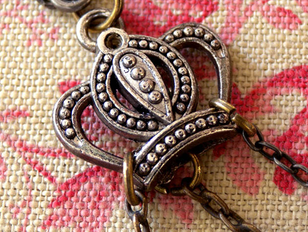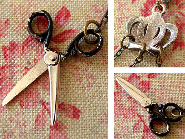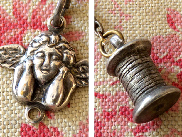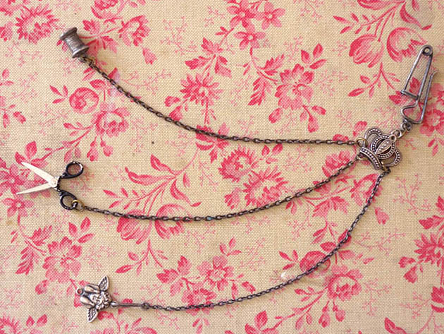 フランスでおそらく1900年代頃にジュモーやシモン&ハルビッヒなどのビスキュイプーペ(ビスクドール)用に真鍮で製作されたボビヌ&シゾー&アンジュ&クロンヌ・プーペシャトレーヌです。Chatelaine(シャトレーヌ)は、18世紀のフランスのブルジョワの婦人達の間で流行したローブ(ドレス)のタイユ(ウエスト)の紐やサンテュール(ベルト)などに掛けるクロシェ(フック)などが付い鎖の装飾品で、鎖には懐中時計やポシェットや鍵などが付けられていましたが、19世紀には庶民の間にも広がり小さなシゾー(ハサミ)や指ぬきや鏡などのが付けられたようです。こちらは超レアなプーペ(ドール)用のシャトレーヌで、本体の上部にはクロシェとエパングルドゥーブル(安全ピン)が付けられています。また、その下には真鍮に銀メッキされたCouronne(クロンヌ/王冠)のデコラシオン(飾り物)が付けられているのも素敵です。また、クロンヌには3本の長い鎖が付けられていてその先端にはBobine(ボビヌ/糸巻き)とCiseaux(シゾー/ハサミ)と翼を広げたAnge(アンジュ/天使)のデコラシオンが付けられていてエレガントでオシャレで可愛くてとてもいい感じです。また、ボビヌは小さいのに糸が巻かれたように作られていてシゾーは本物のように刃が動くのもいいですね。また、シゾーはおそらく1930年代から1950年代頃のもののようです。お気に入りのビスキュイプーペのローブ(ドレス)に付けるととても素敵なとてもむ可愛い一品です。