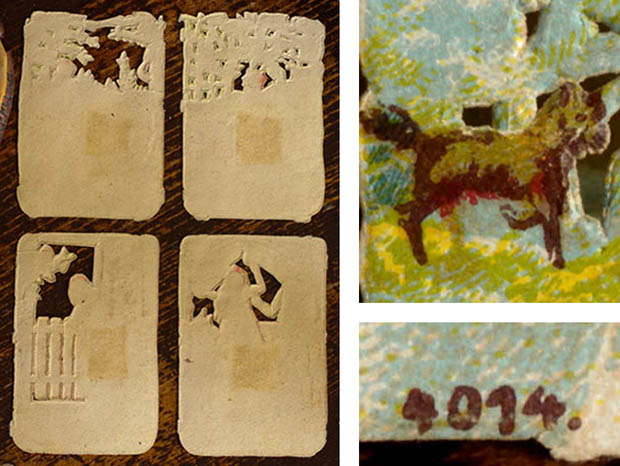 ドイツでおそらく1920年代に製作された厚紙製のロートカピヒェン&ヴォルフ・グランツビルダー4ゼッツです。こちらは超レアなRotkappchen(ロートカピヒェン/赤ずきんちゃん)の楽しいお話の場面のGlanzbilder(グランツビルダー/クロモ)の4枚のゼッツ(セット)で、左上のグランツビルダーには森の家に住んでいる病気のおばあさんにコルプ(バスケット)に入ったクーヘン(焼き菓子)と葡萄酒を届けに行く途中の道で親切そうな悪いヴォルフ(オオカミ)に出会ったロートカピヒェン、右上のグランツビルダーにはおばあさんの家に行く途中で一休みしているロートカピヒェンと急いでおばあさんの家に行く悪いヴォルフ、左下のグランツビルダーには森のおばあさんの家にやって来たロートカピヒェン、右下のグランツビルダーにはお腹いっぱいになって眠っている悪いヴォルフのお腹をハサミで切り裂いてロートカピヒェンを助け出している猟師と猟犬のイラストがデザインされていてどれもオシャレで可愛くてとてもいい感じです。また、とても細かく切り抜かれていますが、エンボス加工もしてあるので立体的でとても凝った作りです。イラストは全て特色インクを使った高価な石版印刷で刷られているのでイラストの発色が良くとてもきれいです。また、左上のグランツビルダーには4014の表示があります。ロートカピヒェンのお話はフランス人のシャルル・ペローが1697年に出版した「ペロー童話集」の中にありますが、1812年頃にドイツ人のグリム兄弟がキンダー(チャイルド)達のために可愛くリメイクして有名になったようです。グランツビルダーを見ているだけでロートカピヒェンの可愛い世界に引き込まれてしまいそうなとても価値ある一品です。