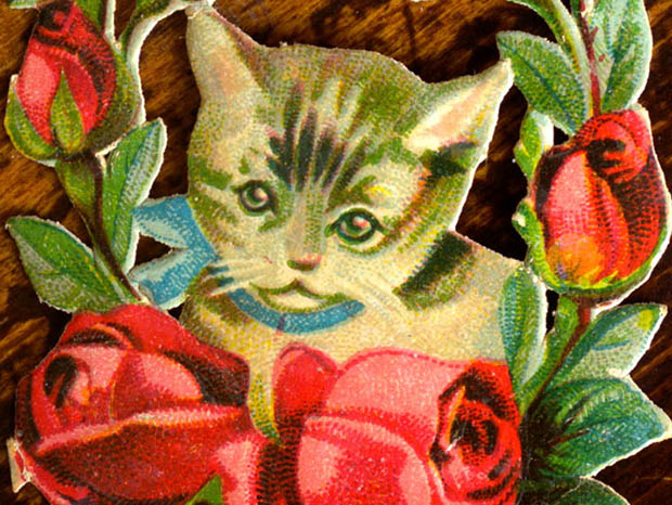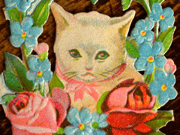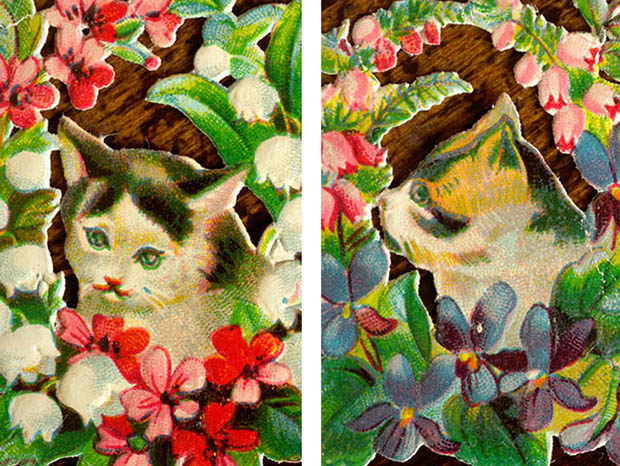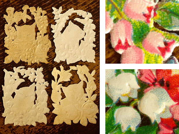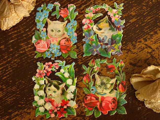 フランスでおそらく1900年代に製作された厚紙製のシャトン&フルールクロモ・4アンサンブルです。こちらは大変レアなシャトン(子猫)達のChromo(クロモ)の4枚のアンサンブル(セット)で、左上からルージュ(レッド)のローズのお花とブルーのミオゾティス(忘れな草)にお花の中のシャトン、ロゼ(ピンク)のガン・ドゥ・ルナール(フォックスグローブ)のお花とスミレ色のヴィオレット(スミレ)のお花の中のシャトン、白いミュゲ(スズラン)のお花とロゼのアマンド(アーモンド)のお花の中のシャトン、ルージュのローズのお花の中のシャトンがデザインされていてどれもオシャレで可愛くてとてもいい感じです。また、イラストは高価な全て特色を使った石版印刷で刷られているので何年経っても発色がよくて素晴らしいですね。また、どれもとても細かく切り抜かれていますが、エンボス加工もしてあるので立体的でとても凝った作りです。クロモの始まりは1880年代頃のアメリカからですが、宣伝効果が高いのでたちまちヨーロッパにも広まったようです。見ているだけで気持ちが優しく癒されてしまいそうな大変可愛いシャトン&フルールクロモ・4アンサンブルです。