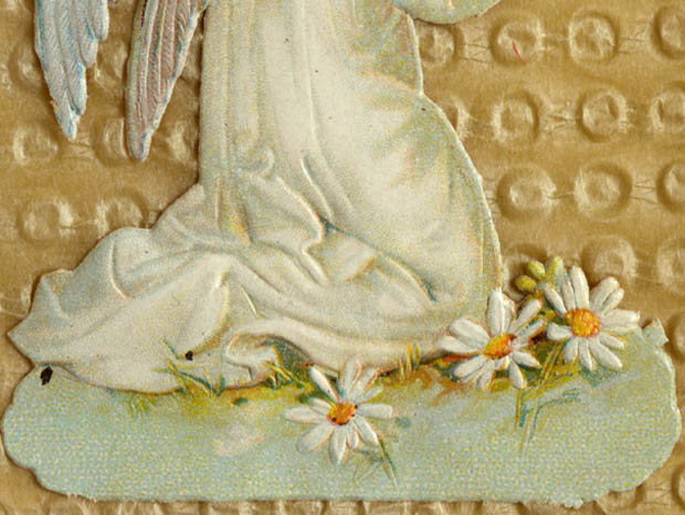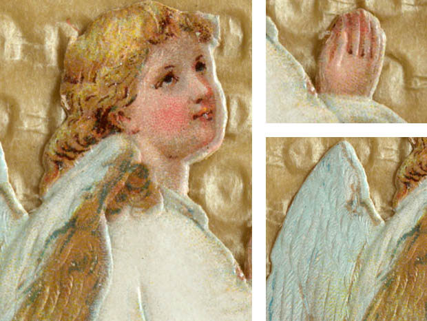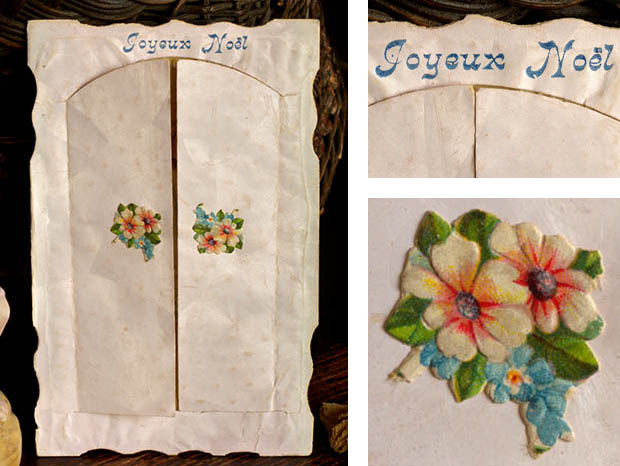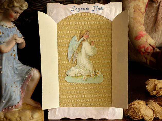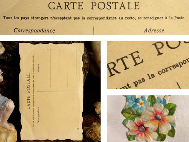 フランスでおそらく1900年代に製造されたデッドストックの厚紙製のアンジュ&マルグリートクロモ・ジョワイユノエルカルトポスタルです。こちらは大変レアなお土産用として販売されていたノエル(クリスマス)用のCarte Postale(カルトポスタル/ポストカード)で、オシャレに型抜きされた淡いロゼブランシュ(ピンクホワイト)の表面には観音開きの扉がありブルーフォンセ(ダーク)ブルーでJoyeux Noel(ジョワイユノエル/メリークリスマス)と書かれています。また、左右の扉には小さなきれいなお花のクロモが貼られています。また、扉を開けると中にはポワン(ドット)模様のエンボスがあるベージュの厚紙の上に白いマルグリート(マーガレット)のお花が咲いた野原で白いローブ(ドレス)を着て跪いてお祈りをしているアンジュ(天使)のクロモが貼られていてオシャレで可愛くてとてもいい感じです。また、クロモは全て特色を使った発色がいい石版印刷で刷られていますが、エンボス加工もしてあるので立体的でとても凝った作りです。また、裏面にはフランス語でCarte Postale, Tous les Pays etrangers n'acceptant pas la correspondance au recto, se renseigner a laposte.(窓口での対応を受け付けていない外国への郵送は郵便局にお問い合わせください) Correspondance(便り) Adresse(住所)の表示があります。120年以上も前に製造された素敵なアンジュ&マルグリートクロモ・ジョワイユノエルカルトポスタルです。