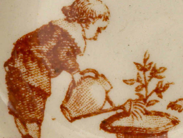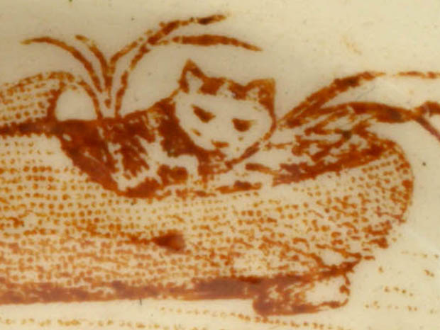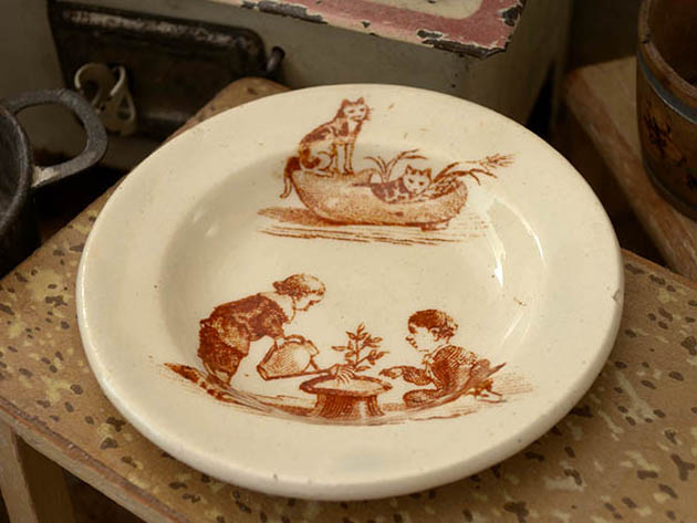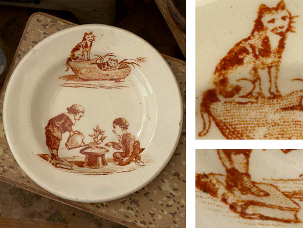 フランスでおそらく1890年代に製作されたLuneville Faience(リュネヴィル・ファイアンス/リュネヴィル陶器)のアンファンディネット・リュネヴィルプティアシェットです。フランスのナンシーから南東へ20kmほど行ったロレーヌ地方のリュネヴィルの町で1711年にJacques Chambrette(ジャック・シャンブレット)が陶器工場を創業したのがリュネヴィル・ファイアンスの始まりのようです。また、ジャック・シャンブレットは1758年に税金逃れのためにリュネヴィルから僅か11km離れたムルト・エ・モゼル県のサン・クレマンの町に新しく工場を設立したようですが、リュネヴィル陶器はフランスで最も有名な陶器会社の一つのようです。こちらは超レアなアンファン(チャイルド)達のディネット(おままごと)用に作られたイヴォワール(アイボリー)の円形のPetite Assiette(プティアシェット/小皿)で、本体の表面には木靴のを寝床にしている二匹の可愛いシャトン(子猫)達、紳士のシャポー・ドゥ・ソワ(シルクハット)を植木鉢にして小さな木を植えて本の上に乗ってアロゾワール(ジョウロ)でお水をかけているギャルソン(男の子)とトレをみているギャルソンの姿がブランで絵付けされていてオシャレで可愛くてとてもいい感じです。また、リュネヴィルの陶器製品はフランスでも大変人気が高くてコレクターズアイテムとなっているようです。このまま飾るととても可愛くて素敵ですが、見ているだけで当時のフランスのブルジョワの家のアンファン達が楽しそうにおままごと遊びをしている姿が想像できそうな超レアな一品です。