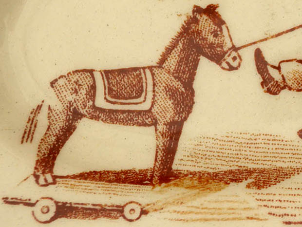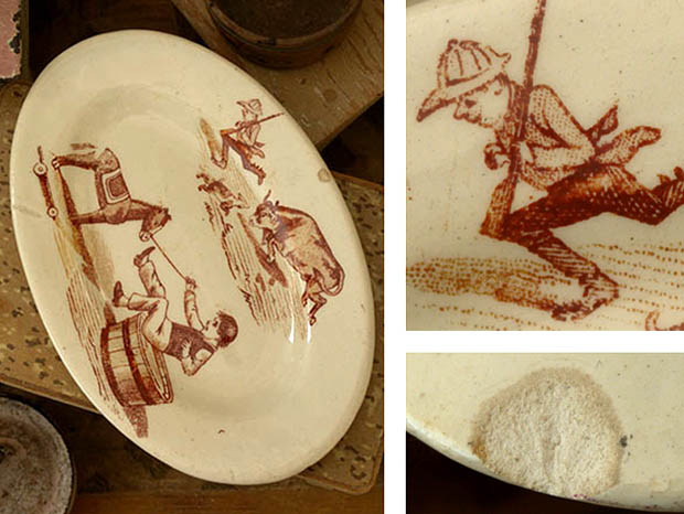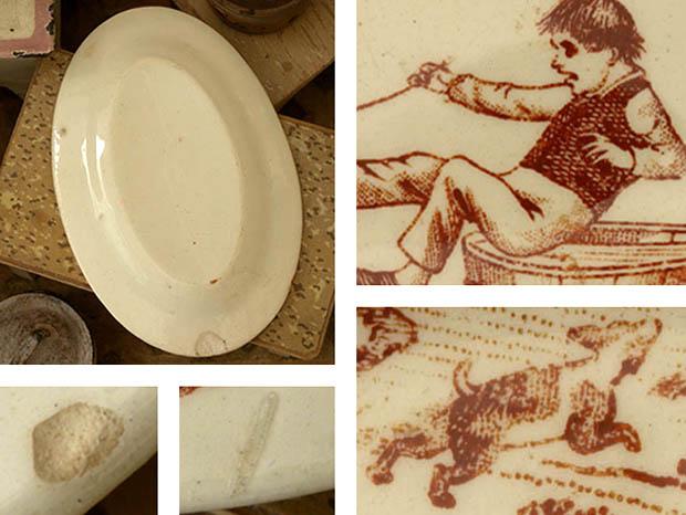 フランスでおそらく1890年代に製作されたLuneville Faience(リュネヴィル・ファイアンス/リュネヴィル陶器)のアンファンディネット・リュネヴィルラヴィエです。フランスのナンシーから南東へ20kmほど行ったロレーヌ地方のリュネヴィルの町で1711年にJacques Chambrette(ジャック・シャンブレット)が陶器工場を創業したのがリュネヴィル・ファイアンスの始まりのようです。また、ジャック・シャンブレットは1758年に税金逃れのためにリュネヴィルから僅か11km離れたムルト・エ・モゼル県のサン・クレマンの町に新しく工場を設立したようですが、リュネヴィル陶器はフランスで最も有名な陶器会社の一つのようです。こちらは超レアなアンファン(チャイルド)達のディネット(おままごと)用に作られたイヴォワール(アイボリー)の楕円形のRavier(ラヴィエ/前菜皿)で、本体の表面には大きな牛に追われて吠えている猟犬と大慌てで逃げている鉄砲をかついだ猟師、木馬のティレジュエ(プルトイ)で遊んでいるギャルソン(男の子)が水を入れた桶に落ちそうになっている姿がブランで絵付けされていてどれもオシャレで可愛くてとてもいい感じです。また、リュネヴィルの陶器製品はフランスでも大変人気が高くてコレクターズアイテムとなっているようです。このまま飾るととても可愛くて素敵ですが、見ているだけで当時のフランスのブルジョワの家のアンファン達が楽しそうにおままごと遊びをしている姿が想像できそうな超レアな一品です。