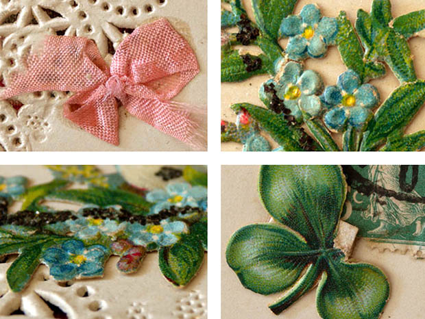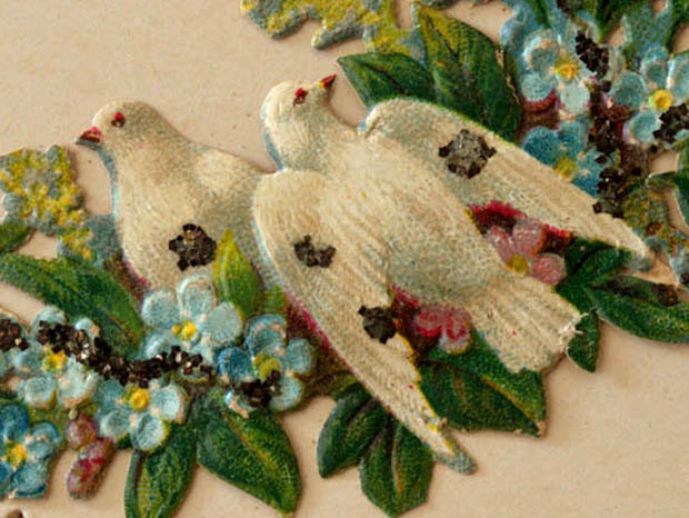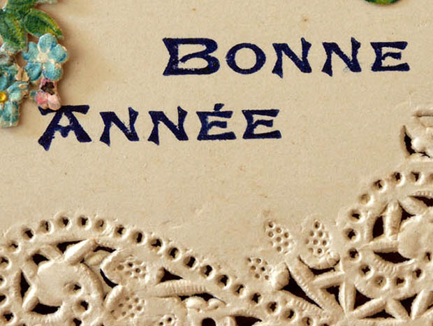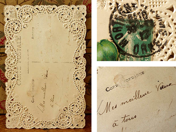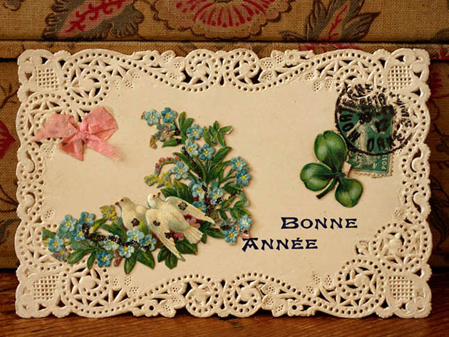 フランスでおそらく1900年代に製造された厚紙製のピジョン&ミオゾティスクロモ・カルトポスタルです。こちらは大変レアなお土産用として販売されていたCarte Postale(カルトポスタル/ポストカード)で、オシャレに型抜きされたイヴォワールブランシュ(アイボリーホワイト)の表面の周りにはまるで繊細なドンテル(レース)のようなアラベスク模様が型抜きでデザインされていてとても素敵です。また、ブルーフォンセ(ダークブルー)でBonne Annee(ボナネー/良いお年を)の文字がデザインされているので年の瀬に投函されたカルトポスタルのようです。また、本体には四つ葉のトレフル(クローバー)のクロモと可憐なブルーのミオゾティス(忘れな草)のお花の中にいる二羽の幸せの白いピジョン(鳩)がデザインされたクロモが貼られていてエレガントでオシャレで可愛くてとてもいい感じです。また、クロモは全て特色を使った発色がいい石版印刷で刷られていますが、エンボス加工もしてあるので立体的でとても凝った作りです。また、ピジョンとミオゾティスのお花の部分にはキラキラと光る金粉のようなものも塗られていてとても素敵です。また、ロゼ(ピンク)のリュバン(リボン)も付けられていてとても素敵です。また、裏面にはフランス語でCarte Postale, Correspondance(便り) Adresse(住所)の表示があります。また、切手には消印がありMontagnes(モンタニエ)の表示があるようです。また、Mes meilleue Vceuse a tous(皆様に心からの祝福を)と書かれているようです。120年以上も前に投函された素敵なピジョン&ミオゾティスクロモ・カルトポスタルです。