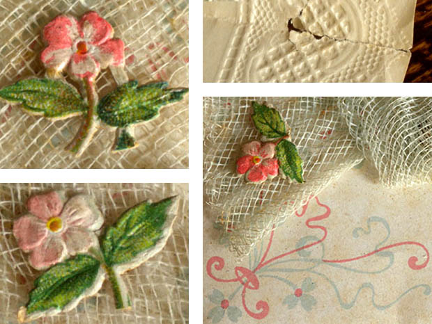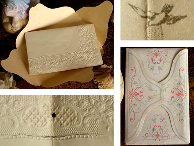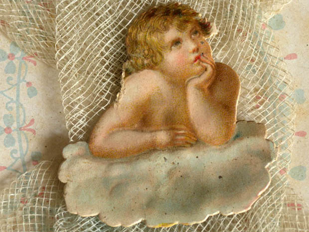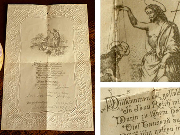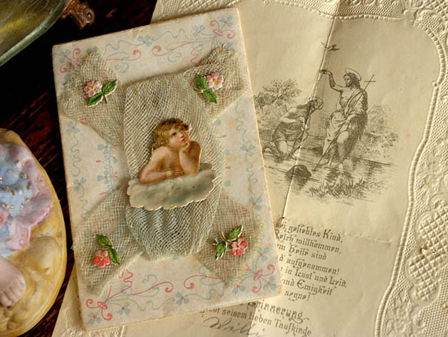 ドイツでおそらく1890年代に製作された厚紙と紙とシュピッツェ(レース)製のエンゲル&ブルーメ・ウムシュラーク&タオフェブリーフです。こちらは超レアなベービ(ベビー)の洗礼の証明書が入っている厚紙製のUmschlag(ウムシュラーク/封筒)で、エルフェンバインヴァイス(アイボリーホワイト)の本体には淡いローザ(ピンク)とブラウグリュン(ブルーグリーン)でお花のアラベスク模様がデザインされていてとても素敵です。また、表面には結んだグラウ(グレー)がかったエルフェンバイン(アイボリー)のチュールシュピッツェが貼られていますが、チュールシュピッツェの四隅には可愛いローザのブルーメ(お花)のグランツビルダー(クロモ)が貼られています。また、中央には雲の上で羽を広げて顎に手を当てて物思いにふけっていユング(少年)のエンゲル(天使)のグランツビルダーが貼られていてエレガントでオシャレで可愛くてとてもいい感じです。また、ウムシュラークを開けると中には四つ折りになったエルフェンバインの紙のTaufbrief(タオフェブリーフ/洗礼証明書)が入っています。また、繊細なシュピッツェのようなエンボス加工がされたタオフェブリーフは、ドイツの古いフラクトゥール書体の文字で書かれているので判読しにくいですが、Willkommen sei getiehtes Kind. Ju Jesu Reirh millkommen, Worin lu ihrem Heile sind(ようこそ、愛しい子よ。イェーズス(イエス)の国へようこそ、そこに彼らの救いがある)などと書かれているようです。また、川でお祈りをしながらひざまずいてイェーズス・クリストゥス(イエス・キリスト)から頭に水をかけられて罪を洗い清めて神の子として新しい生命を与えられる洗礼を受けているイラストがデザインされているのも素敵です。タオフェブリーフが入った可愛いエンゲルとブルーメのグランツビルダーが貼られたウムシュラークを見ているだけで気持ちが優しく癒されてしまいそうなオシャレで可愛い大変素晴らしい一品です。