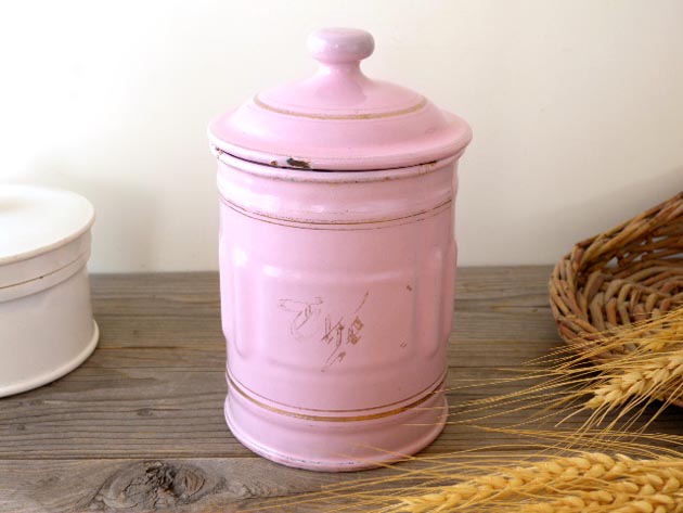 おそらく1930年代にフランスで製造されたピンクのホウロウキャニスターです。20世紀初頭のヨーロッ