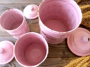 おそらく1930年代にフランスで製造されたピンクのホウロウキャニスター3個セットです。20世紀初頭