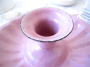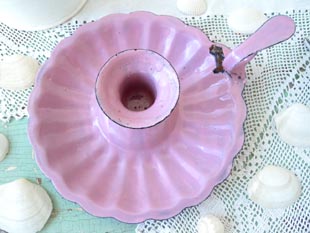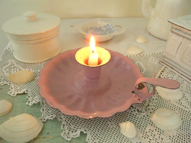 おそらく1900年代初頭にフランスで製造されたホウロウ製のピンクのキャンドルホルダーです。ホウロウ