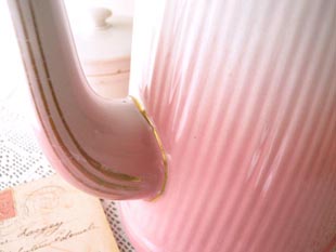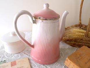 のカフェポットは一般家庭に普及していったようです。こちらは白地にサーモンピンクのグラデーショ