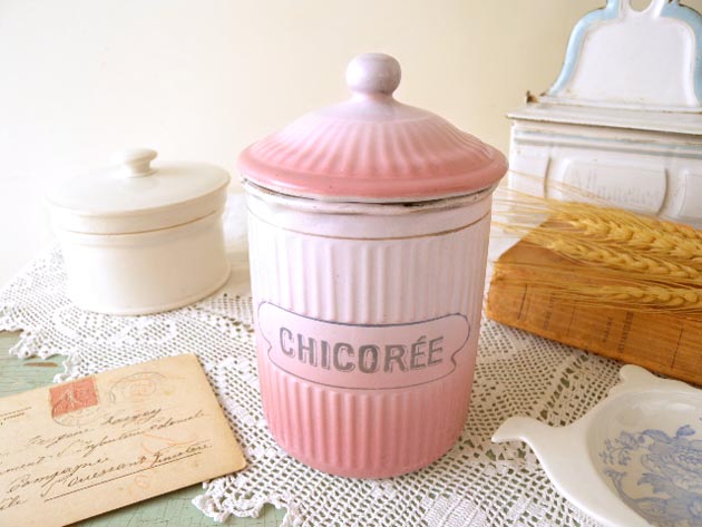 おそらく1930年代にフランスBB社が製造したホウロウ製のチコリー(トチノキの新芽)キャニスターです。