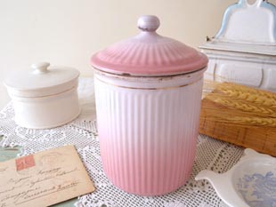 ツを入れるためのキャニスターで白地にサーモンピンクのグラデーションカラーが美しく吹き付けられて