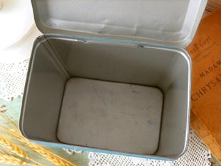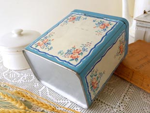 缶です。こちらはブルーグレーとクリームのツートンカラーにピンクのバラの花がデザインされたスト