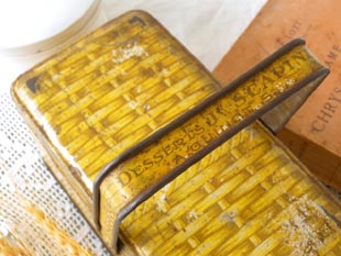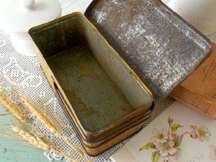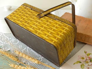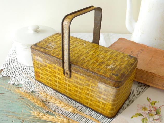 ていたティン製のバスケットです。こちらは大変レアな取っ手とヒンジで開閉するフタが付いたビスケッ