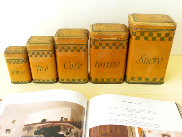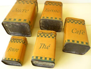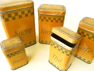 リーンカラーのチェック模様のストレージ缶5セットで、カーシブ書体でロゴがデザインされてSucre(シュ