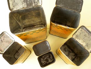 ド名のティン製のグリーン&アイボリーチェックストレージ缶5個セットです。こちらはアイボリー地にグ