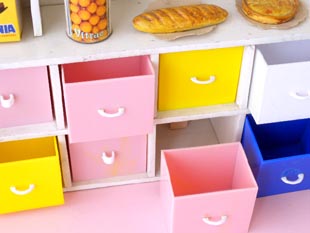 また下段には商品のストック用の引出しがありビンクが6個とイエローが2個、ホワイトとダークブルーが