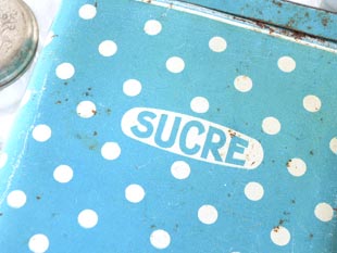 ちらは大変レアなブルー地にホワイトのポルカドット模様のシュクレ缶で、ホワイトのオーバルの中に