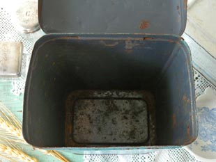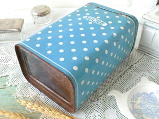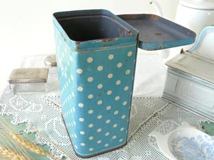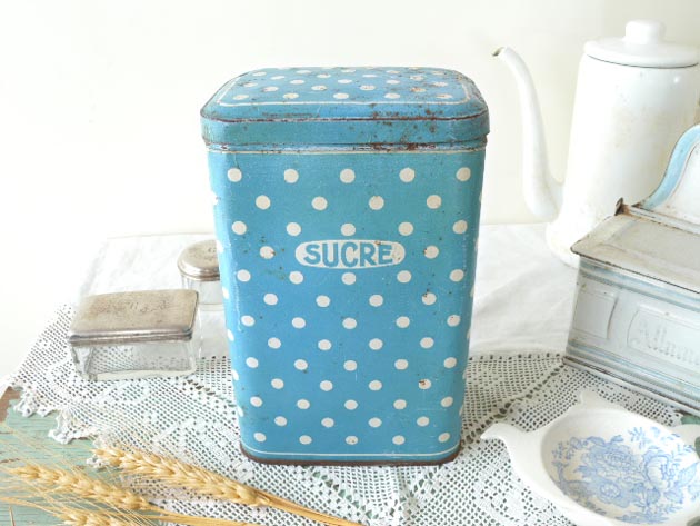 おそらく1930年代にフランスで製造されたティン製のホワイト&ブルーポルカドットシュクレ缶です。こ