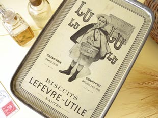 メーカーのルフェーヴルユティル社がおそらく1920年代に製造したビスケットが入っていたティン製のバ