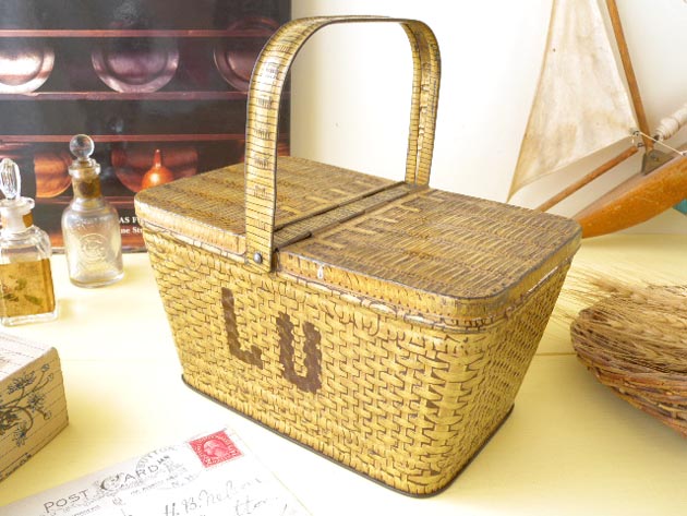 スケットで、左右両開きのフタの付いたウィッカーのデザインで塗装されたティン製のバスケットの側面