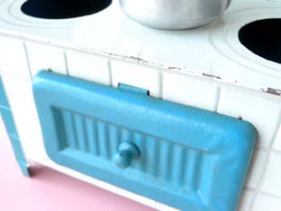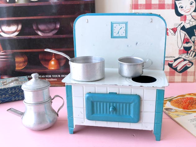 フランスでおそらく1940年代に製造されたティンとアルミ製のフレンチトイオーブンレンジセットです。