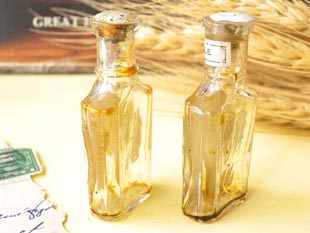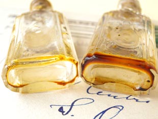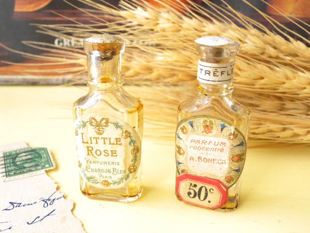 おそらく1910年代にパリで製造された香水が入っていたガラス製のリトルパフュームボトル2個セット