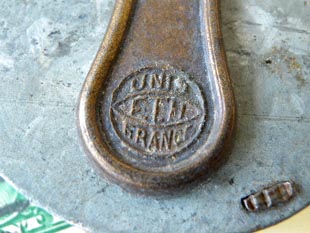 してリベットで留めた構造で、本体にはキーホールに異物が入らないようにUnis F.T.H. Franceのエンボ