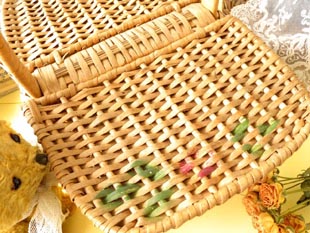アなラタンで制作された少し大きいサイズのおそらくチャイルド用のピクニックバスケットで、丁寧に編