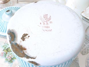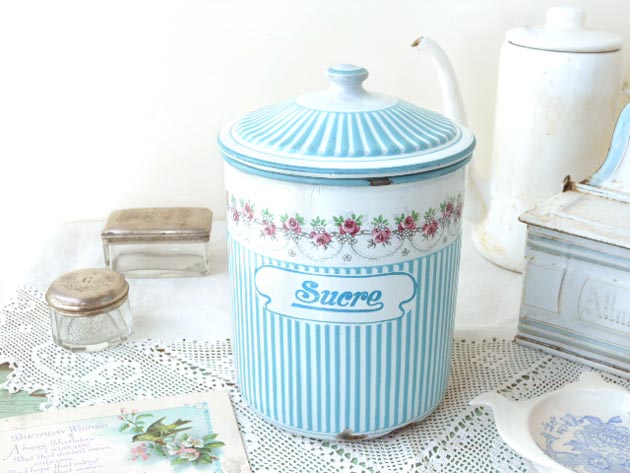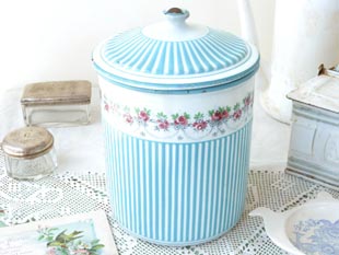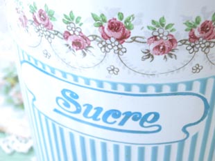 クレ(シュガー)を入れるためのキャニスターで、白地に爽やかなライトブルーのストライプの柄にローズ