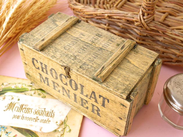 く1900年代の初頭に製造したショコラが入っていた木製のショコラボワットです。ムニエ氏は薬剤師で創