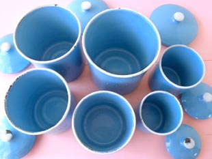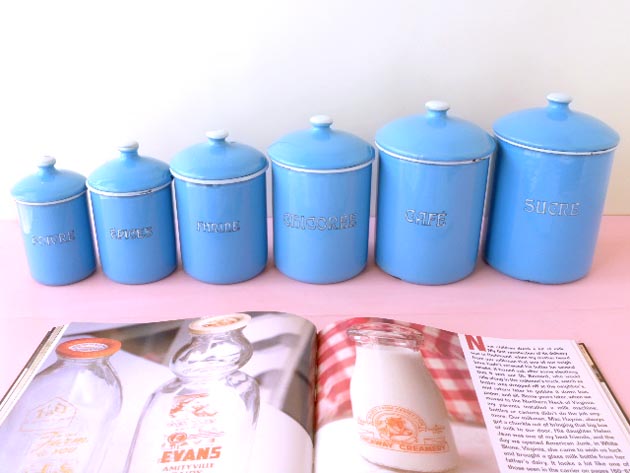 6個セットです。こちらは爽やかなフレンチブルーに取っ手とトリムがホワイトのキャニスター6個セッ