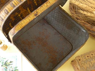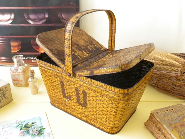 ケットバスケットで、左右両開きのフタの付いたウィッカーのデザインで塗装されたティン製のバスケッ
