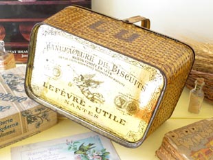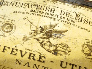 メーカーのルフェーヴルユティル社がおそらく1890年代に製造したビスケットが入っていたティン製のエ