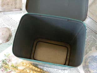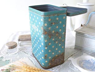 こちらは大変レアなブルー地にアイボリーのポルカドット模様のシュクレ缶で、アイボリーのオーバルの