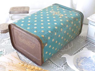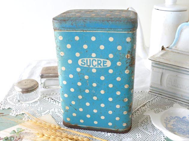 おそらく1930年代にフランスで製造されたティン製のブルー&アイボリーポルカドットシュクレ缶です。