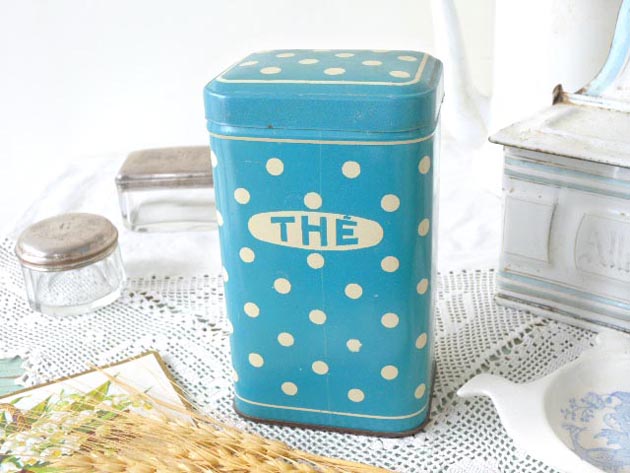 おそらく1930年代にフランスで製造されたデッドストックのティン製のブルー&アイボリーポルカドッ