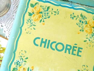 おそらく1940年代にフランスで製造されたティン製のチコリーローズストレージ缶です。こちらはチコ