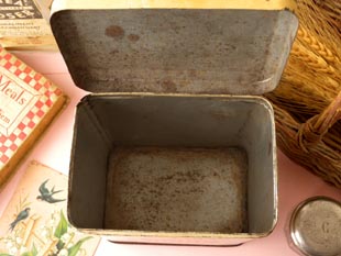 おそらく1940年代にフランスで製造されたティン製のピンクローズボーダーシュクレストレージ缶です。