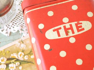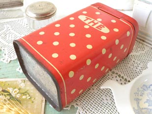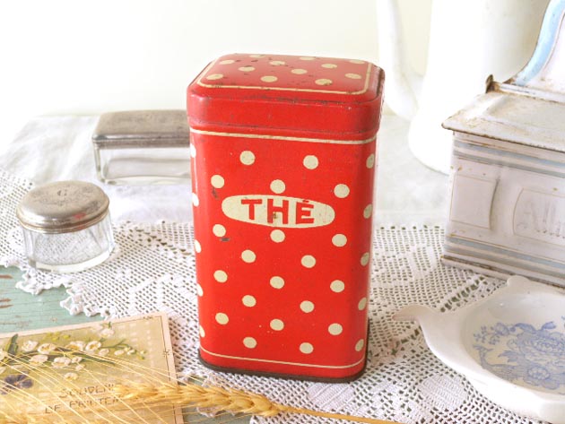 おそらく1940年代にフランスで製造されたティン製のレッド&アイボリーポルカドットティー缶です。