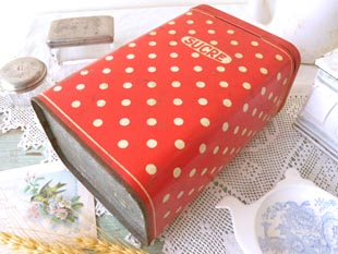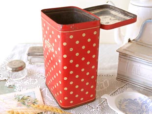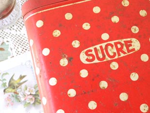 おそらく1940年代にフランスで製造されたティン製のレッド&アイボリーポルカドットシュクレ缶です。