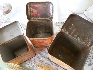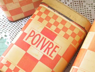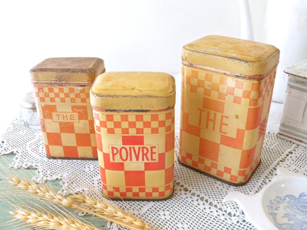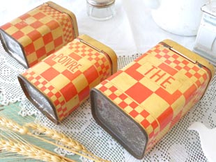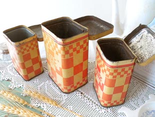おそらく1930年代にフランスで製造されたティン製のレッド&クリームチェッカーストレージ缶3個セッ