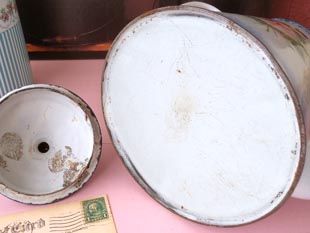 写真のようにホウロウの剥がれやキズやサビや汚れなどありますがローズとパンジーのイラストの状態が
