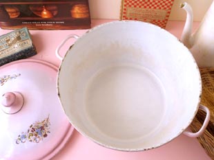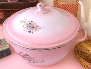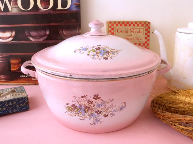 おそらく1930年代にフランスで製造されたホウロウ製のピンクグラデーションフローラルキャセロールで
