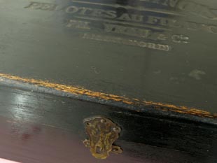 写真のようにフタの真鍮の留め金の釘が一本欠損していますがぐらつきはありません。多少の塗装の剥が