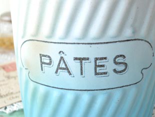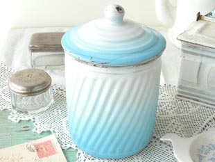 を入れるためのキャニスターで、ホワイト地にブルーのグラデーションカラーとゴールドのトリムが美し