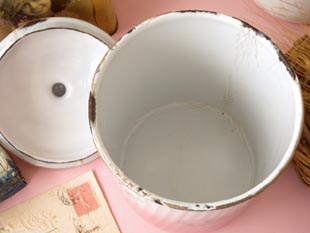 フタや本体に少しホウロウの欠けがあります。多少のキズやサビや汚れなどがありますが古いものにして