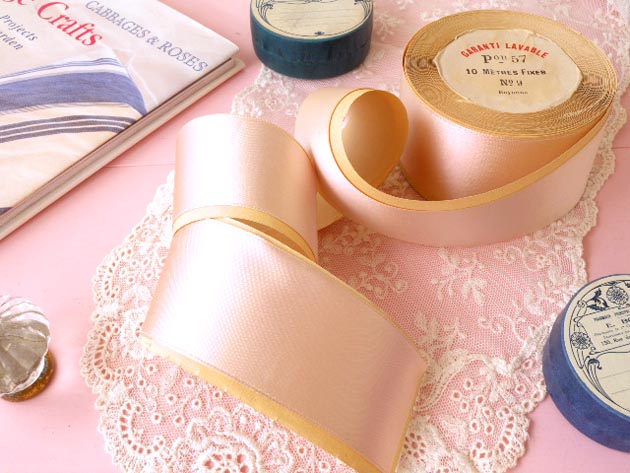 おそらく1930年代にフランスで製造されたレーヨン製のペールピンクサテンタフタリボンです。サテンタ
